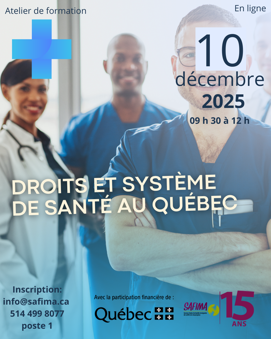 Le SAFIMA a le plaisir de vous inviter à un atelier d’information en ligne intitulé « Les droits et système de santé au Québec », qui se tiendra le mercredi 10 décembre 2025, de 9 h 30 à 12 h.