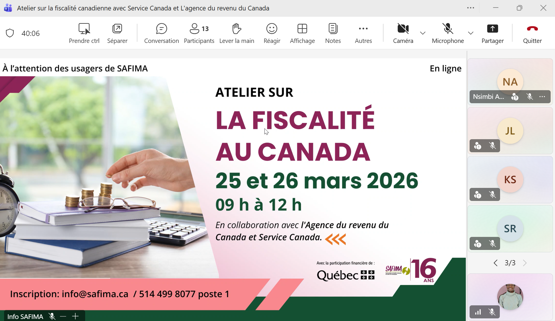 Le Service d’aide à la famille immigrante de la MRC de L’Assomption (SAFIMA) a eu le plaisir d’organiser, en partenariat avec Service Canada et l’Agence du revenu du Canada, un atelier de formation et d’information destiné aux nouveaux arrivants.