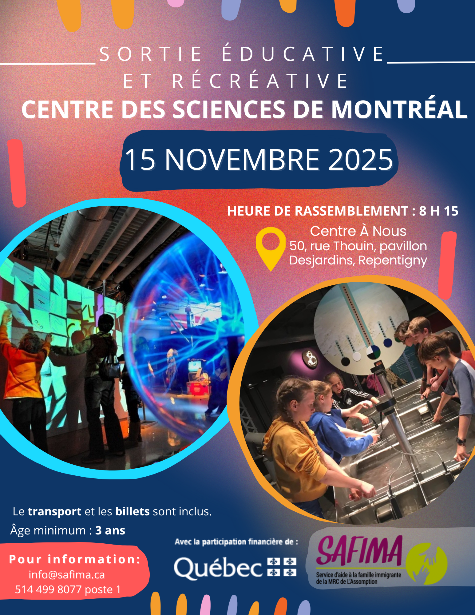 Le SAFIMA a le plaisir de vous inviter à une sortie éducative et récréative au Centre des sciences de Montréal! Venez vivre une journée exceptionnelle en famille, remplie de découvertes, d’expériences interactives et d’occasions de pratiquer le français dans un contexte ludique.